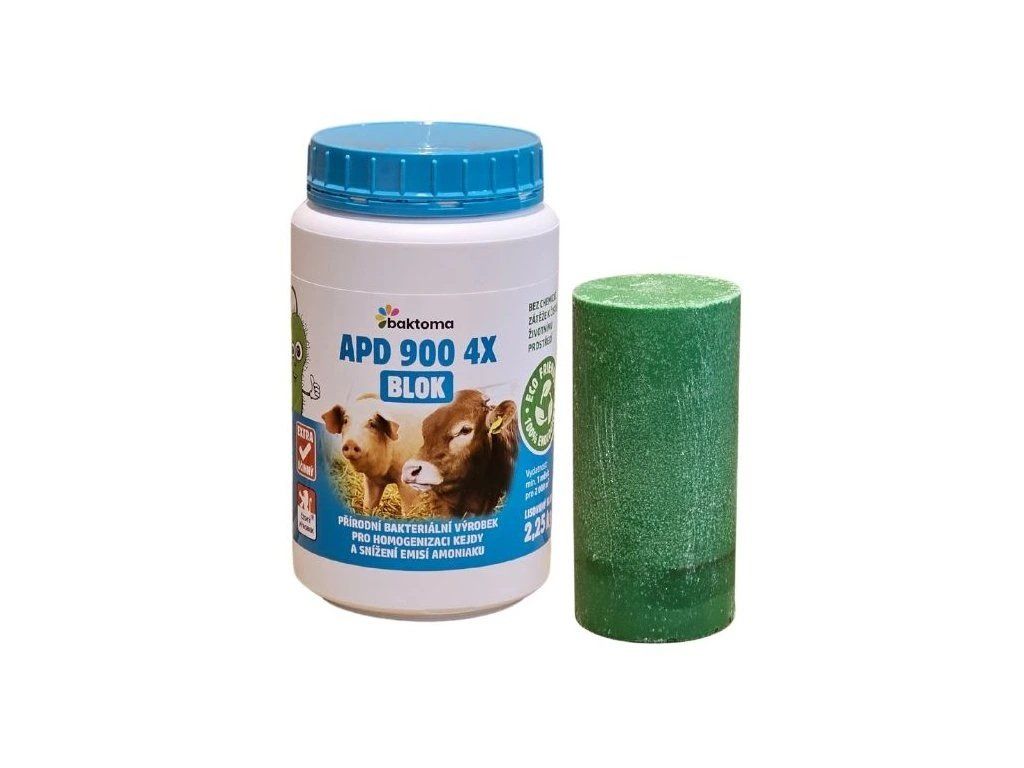 Přípravek APD 900 4X BLOK je směs speciálních přírodních bakterií (aerobních i anaerobních), pěstovaných pro svoji schopnost rychle a účinně rozkládat a zkapalňovat organické odpady (kejdy). Tyto netoxické a geneticky nemodifikované výkonné přírodní bakterie rozkládají zejména sacharidy a bílkoviny. Jedná se o nejefektivnější rozklad biologických odpadů.